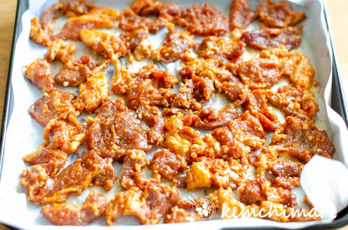 - At this point, you can STOP and store the marinated Korean spicy pork in the fridge for a day or so to cook later OR you can even FREEZE in portions wrapped in parchment paper. (this is a great trick I learned from Eunhyang and I love it! because it doesn’t stick all together in the freezer like it happens when wrapped in plastic). Then whenever you are ready to cook, just defrost the Korean spicy pork and continue the next steps right before putting in the oven. The reason for not adding the garlic and maesil before freezing is that sometimes the flavors of the garlic get muted or even a little bitter when frozen. Eunhyang says she found it best to add the garlic and maesil right before putting in the oven.