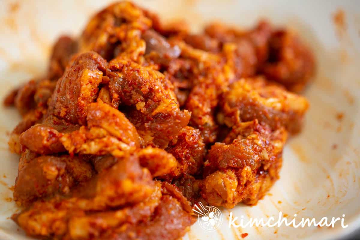 To the chili powder soy sauce coated pork, add chopped garlic and measil cheong (green plum extract). Mix and massage everything well by hand.