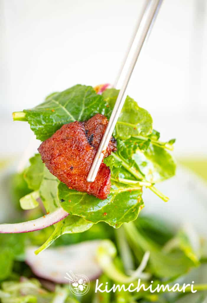 And how I love to enjoy this oven-baked Korean spicy pork is with some green onion salad – Pa Muchim – like so!
