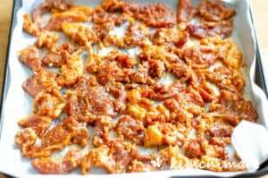Line a sheet pan with parchment paper (or tin foil but parchment paper works well), spread all the pork pieces out in one layer. This is so they are cooked evenly.