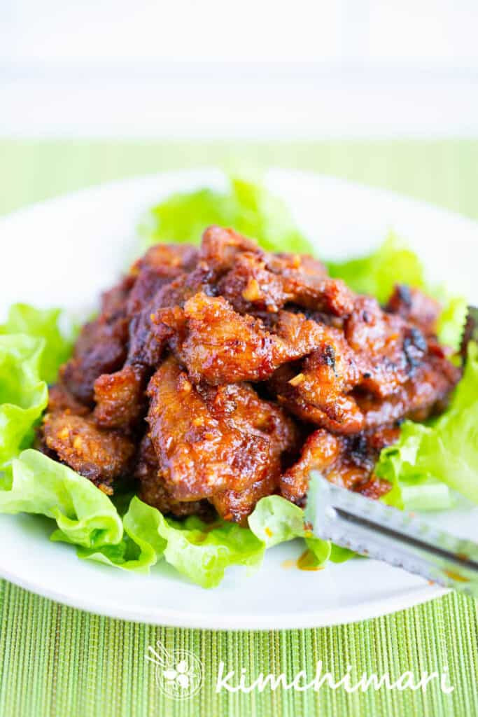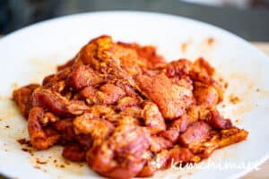 This recipe only needs 4 ingredients besides pork – soy sauce, Korean red chili powder (gochukaru), garlic, green plum extract (maesil cheong). I know not everyone can get the green plum extract (btw, if you can buy it or make your own, I highly recommend it) so if you can’t, you can use my substitute recipe which is water, apple cider vinegar and sugar. Here’s my maesil cheong recipe if you want to make your own at home.