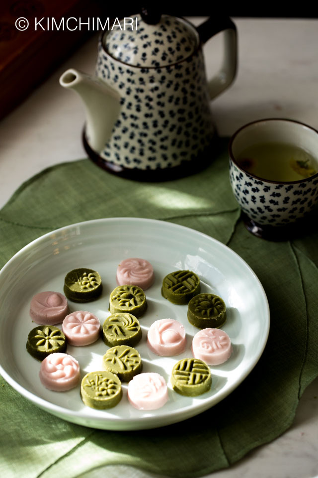 With Tea (차 cha): I already wrote about the history of Dasik (다식 茶食) in my previous post where I shared recipes for Sesame Tea cookies (white, black and yellow sesame). Just quickly, the tradition of enjoying these Korean matcha green tea cookies and other flavors with traditional Korean tea is over 400 years old.