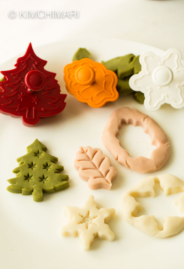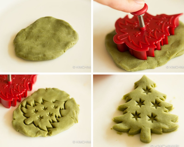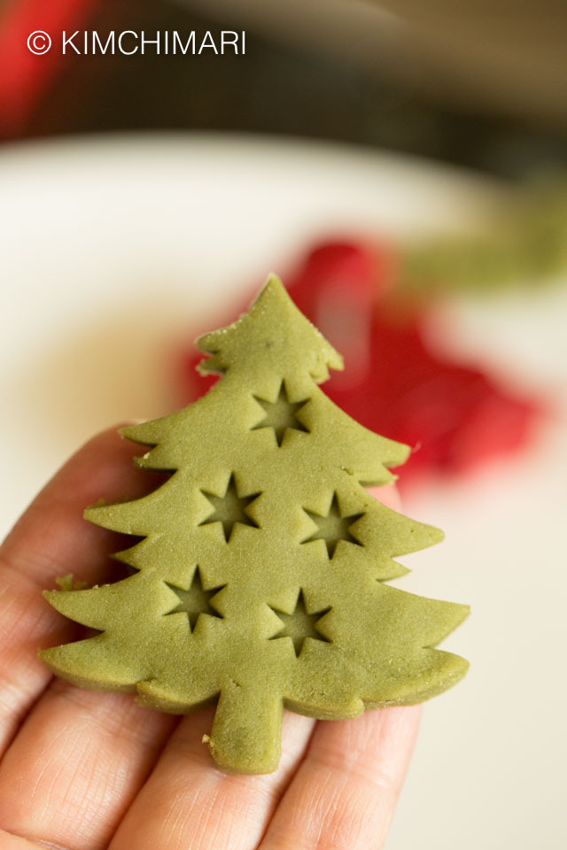 Here I used a Christmas tree design Piecrust Cutter and don’t you just LOVE how it came out?? Small cookie cutters work better as these tea cookies are best handled when they are small. TIP – lightly coat the work surface with some sesame oil before you press with the cutter. Cookies come off the plate much easier that way.