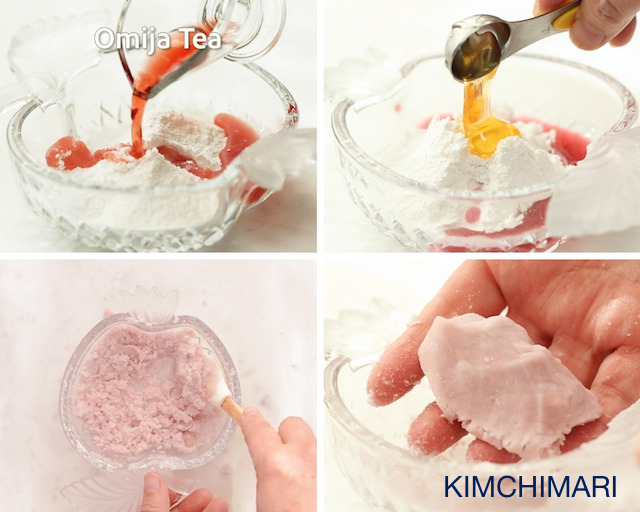 In a bowl, add roasted white rice flour, powder sugar, honey and Omija tea. Mix and form into a ball.