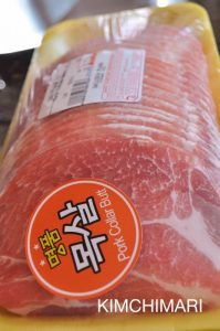 1. Traditionally, thinly sliced pieces from the neck, shoulder or hind leg (ham area) are used for pork bulgogi. The cut I bought from my local market is from the neck (collar butt) and it’s called moksal (목살) in Korean.
