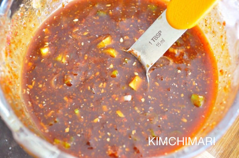 The recipe here is the closest I could get to that taste except it is probably not as spicy – or maybe I am just better at eating spicy foods now. You are welcome to increase the amount of red chili powder or gochujang if you want to add more kick to it. I will leave that up to you.