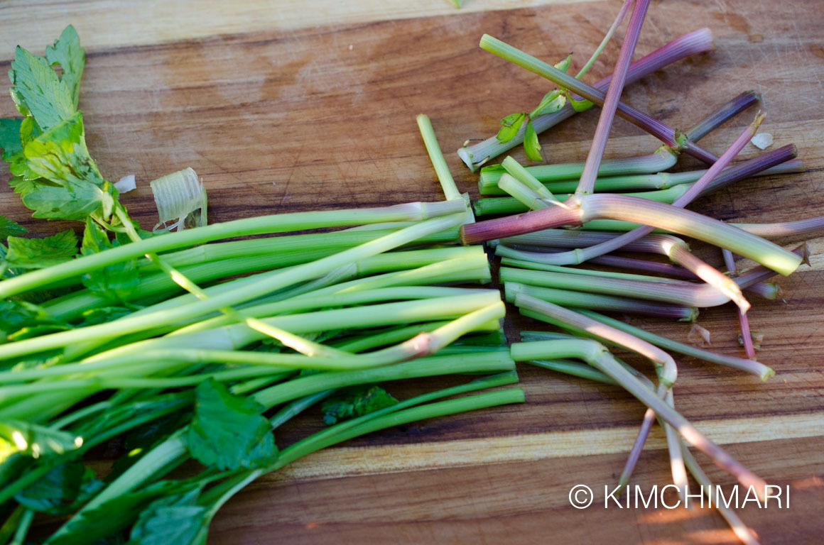 Wash and cut water dropwort into 2 in (5cm) lengths. Discard the very leafy parts on top and also the bottom thick stems that are too fibrous (like cutting off the thick stems off of asparagus).