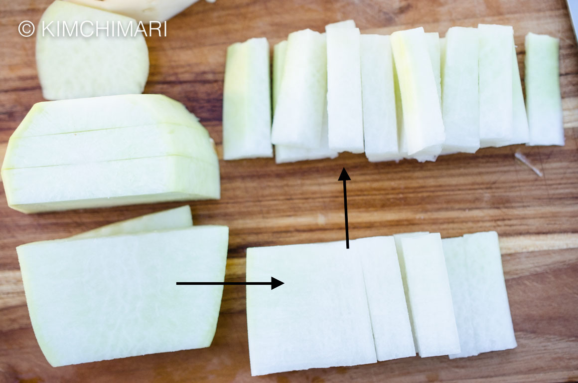 Peel and cut Korean radish into 1.5 in (1.75 cm) thick chunks –> cut each thick round chunk vertically into 0.5 in (1.2 cm) thick slices –> and then each slice into 0.5 in (1.2 cm) thick batons