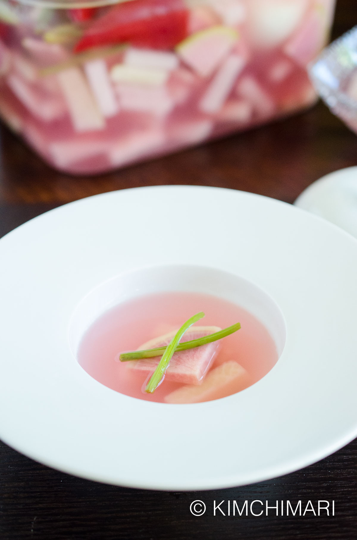 Korean Water Kimchi (Mul Kimchi) with Watermelon Radish