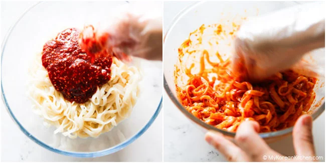 5. In a clean bowl, combine the cooked noodles with the bibimmyeon sauce. Toss until the noodles are thoroughly coated.