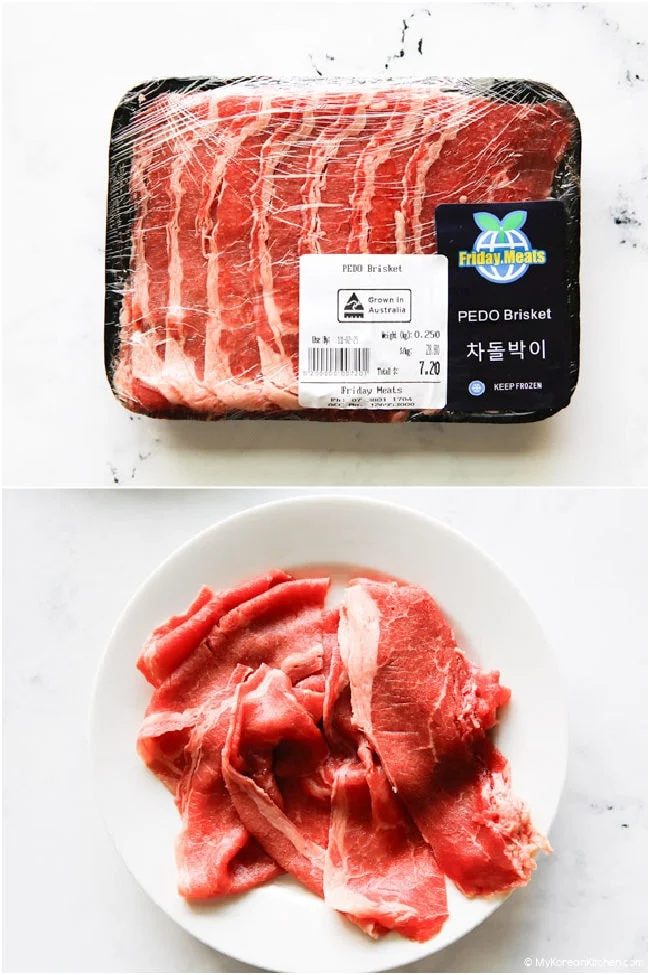 Thinly sliced brisket is readily available at most Korean grocery stores or K-butchers, with each slice measuring 0.1 to 0.2 cm (0.04 to 0.08 inches). I highly recommend getting this cut to save time and effort.