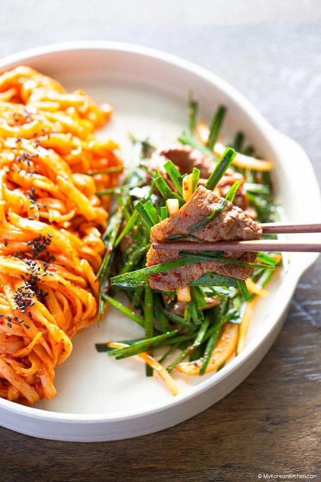 This gourmet delight masterfully fuses noodles, salad, and meat, featuring thinly shaved chadolbaegi, or beef brisket, seared to juicy perfection. Fragrant garlic chives add a refreshing contrast to the rich beef, all enhanced by a delicious dressing made with authentic Korean seasonings. The knife-cut noodles provide a chewy texture, perfectly soaking up the bold, spicy sauce, making every bite a satisfying blend of heat and zest.