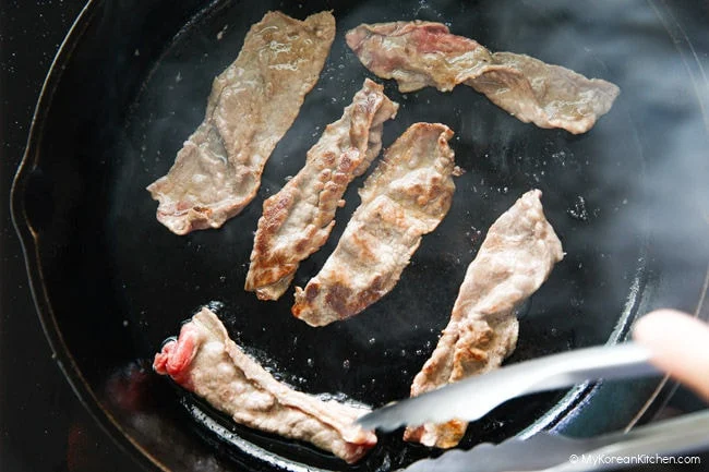 2. Preheat a skillet over medium heat and add a splash of cooking oil. When the oil is hot, add the brisket and cook until lightly browned and tender. – I prefer my meat cooked to medium to medium-well.