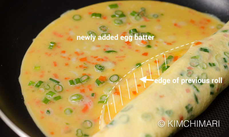 Turn heat on to LOW. Pour another cup of egg mixonto the panBUT (IMPORTANT!!)start pouring the egg in the area of the unrolled egg.So that the newly added uncooked egg mix will merge and stick to the unrolled, not yet fully cooked part and the egg roll can continue. See picture above.
