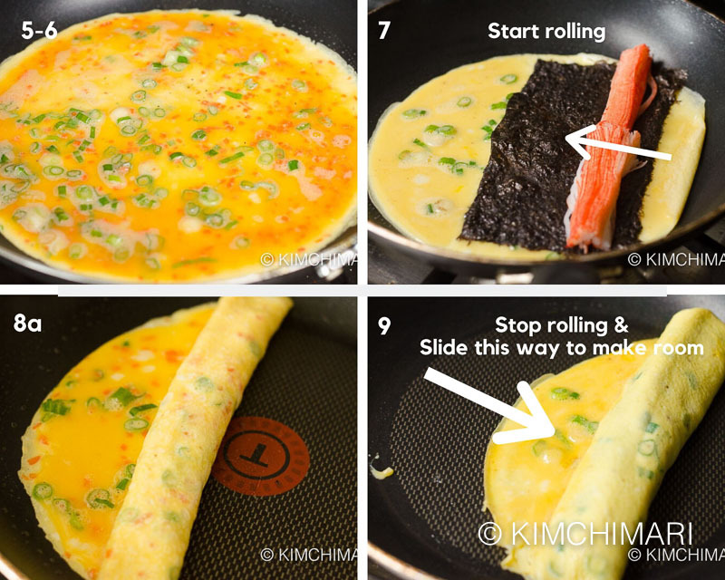 Be patientand don’t roll too early. Wait until the egg is partially cooked before you start to roll. If you roll before the egg is set, the raw egg mix will leak out to the sides and kind of make a mess.