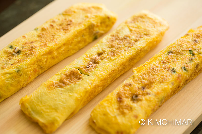 Raise heat to mediumand continue cooking the egg roll (gyeran mari) on all sides to brown them and to get a nice rectangular bar shape. Also to make sure gyeran mari is cooked all the way through. Don't overcook since that will make it tough.