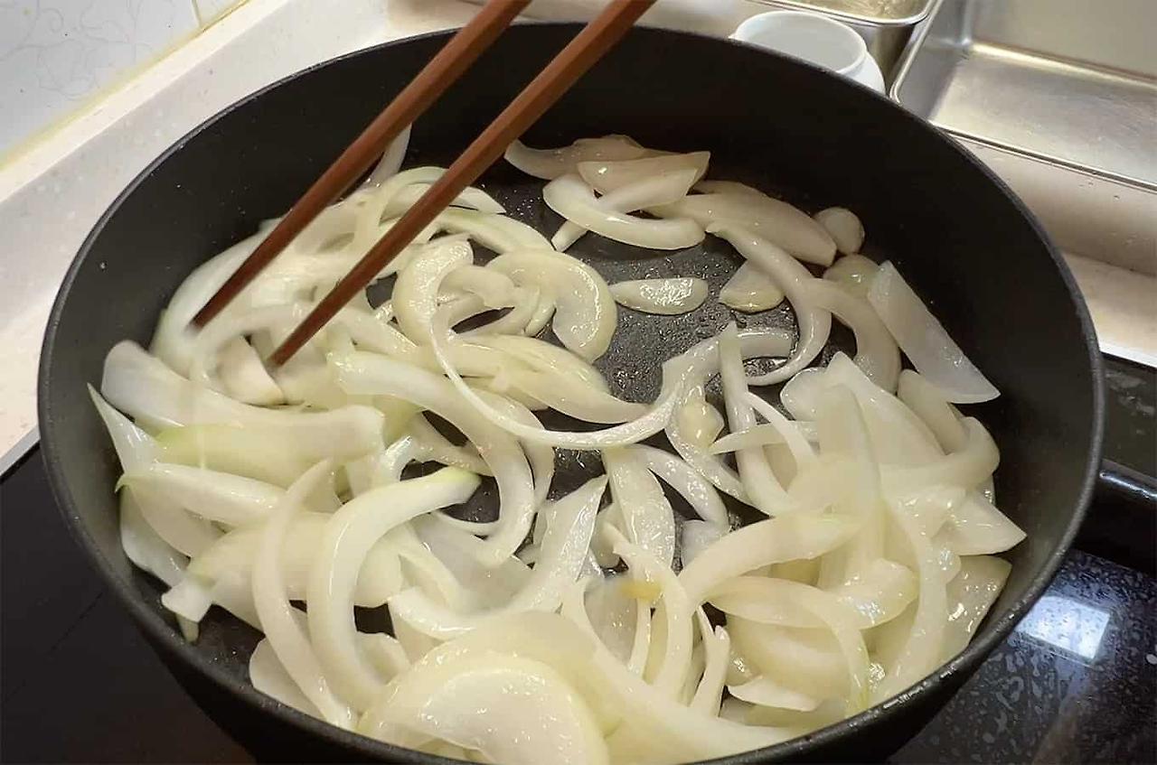 Season the onion slices with a few pinches of salt. Stir-fry for a few minutes - or until the onions start to sweat and turn translucent. Then set aside, onto a tray.