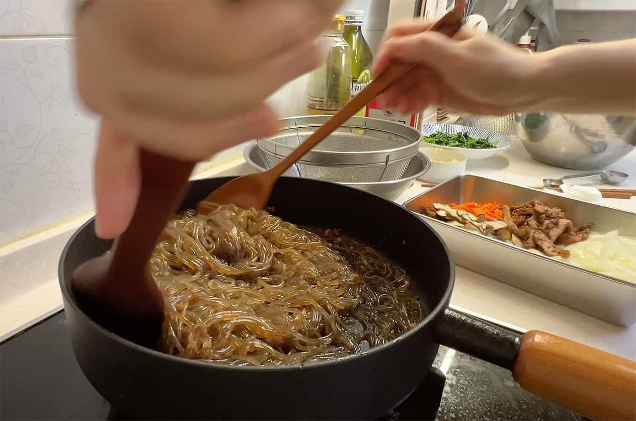 Place the frying pan on medium heat. Use a wooden utensil and gently mix the ingredients together. Once the mixture comes to a boil, add in the boiled dangmyeon noodles.