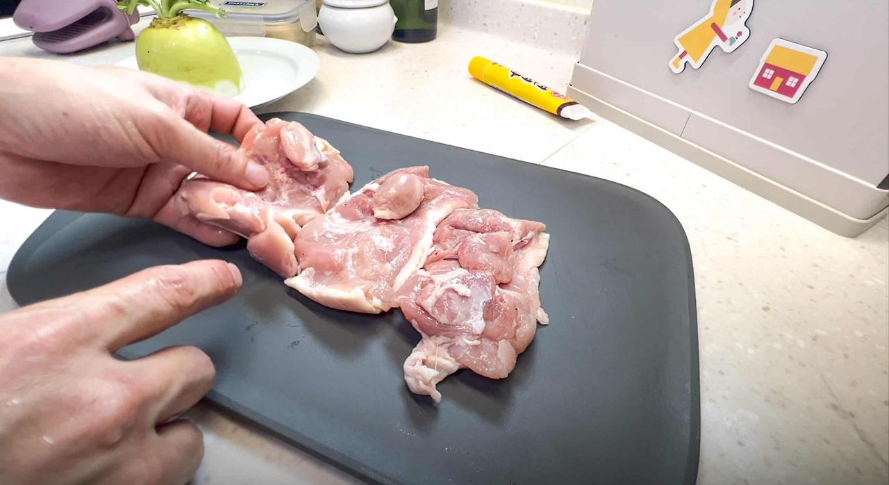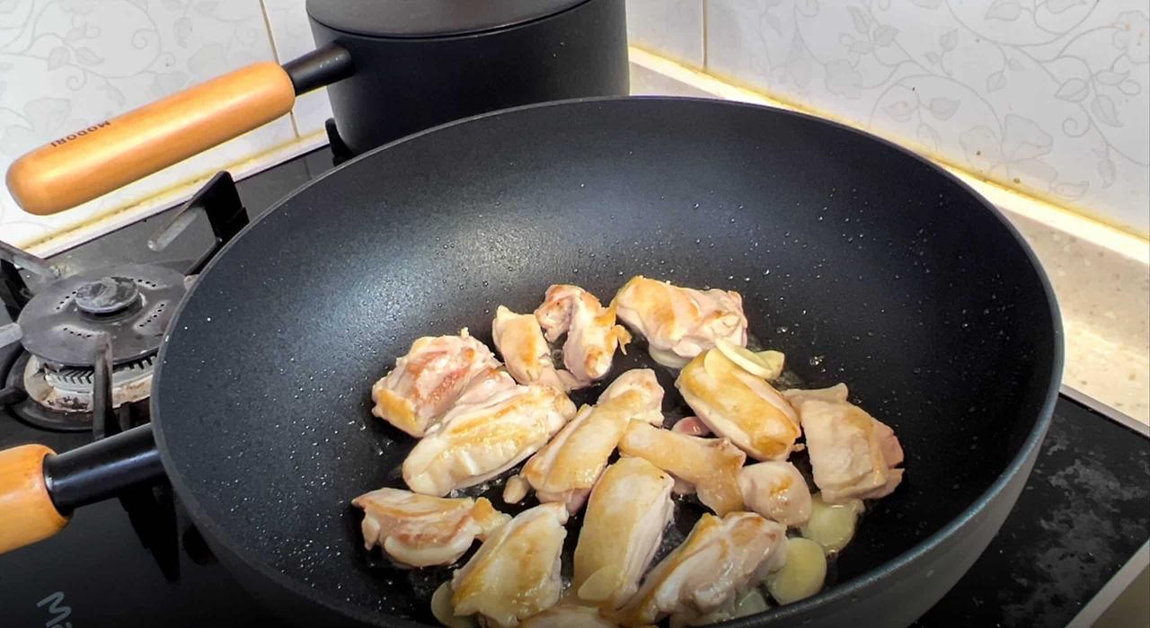 Pan-fry the slices of chicken thigh, so that it gets good coloring on the skin-side and releases its oils (this is the base flavor).