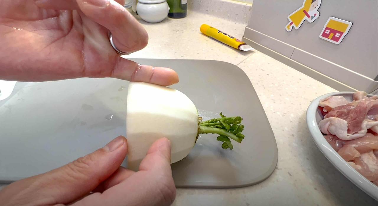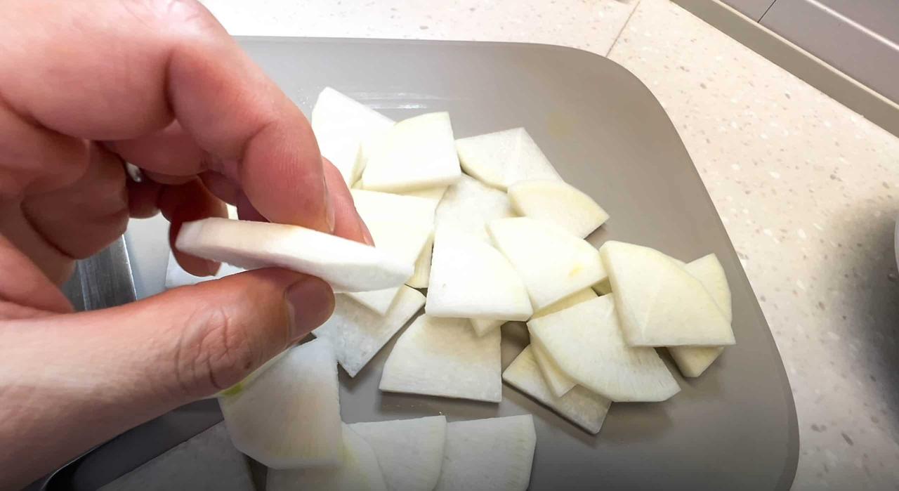 - Cut the Korean radish into thin slices - so they cook through quickly in a stir-fry.