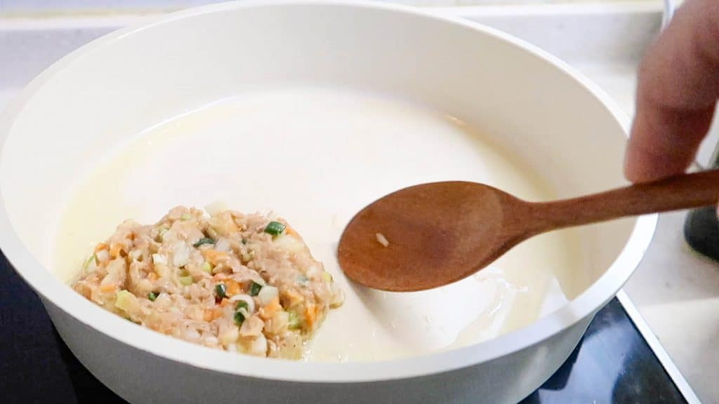 Use a wooden utensil and shape the mix into a small circle - gently shape against the edge of the frying pan to shape. Repeat this step and add a few more circles to the frying pan.