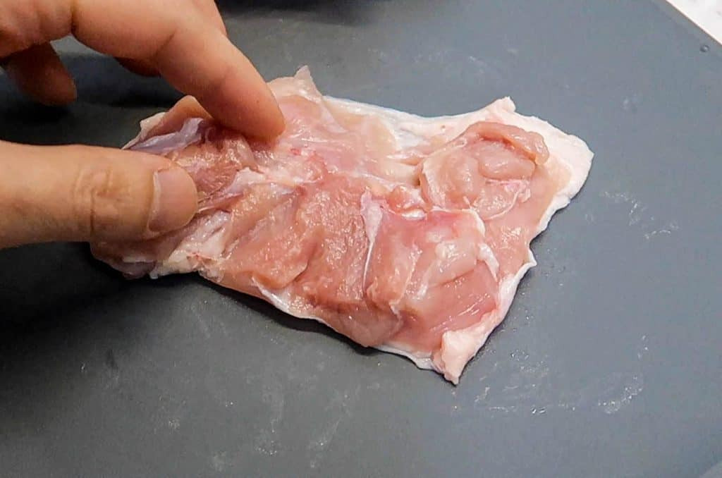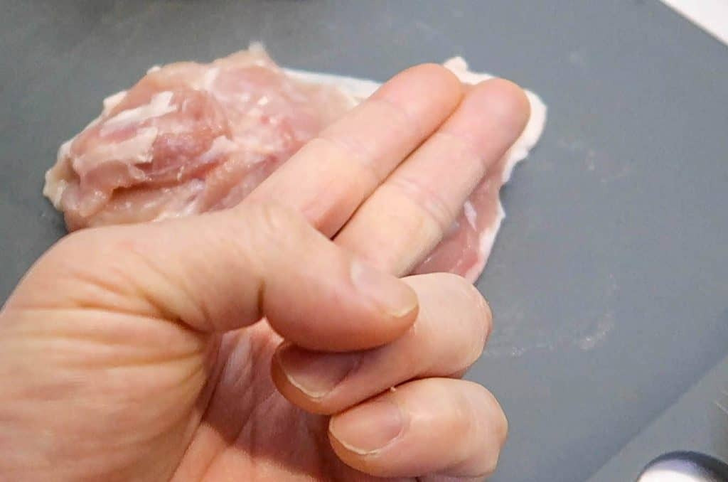 Use two fingers to estimate the width you need to cut each chicken thigh (as instructed in video). Then cut them.