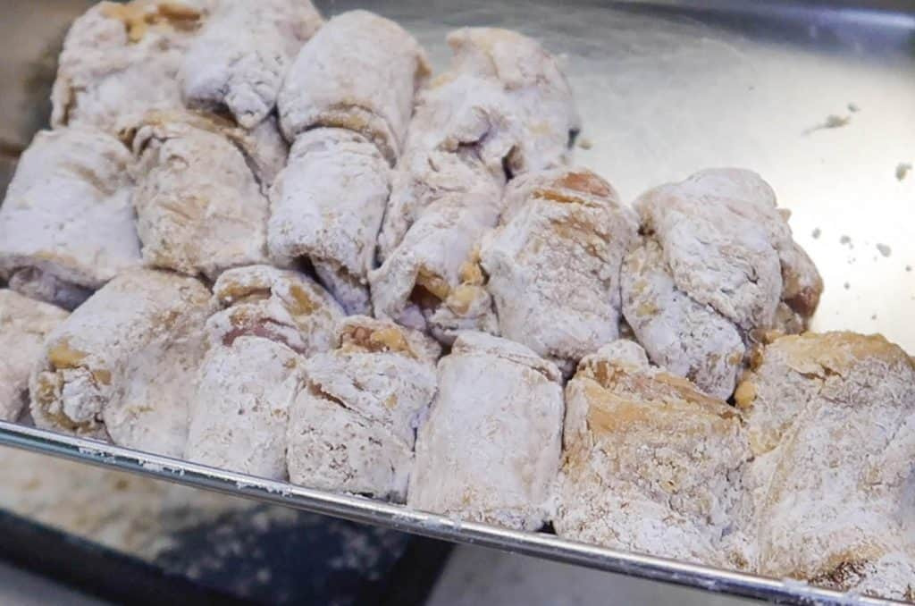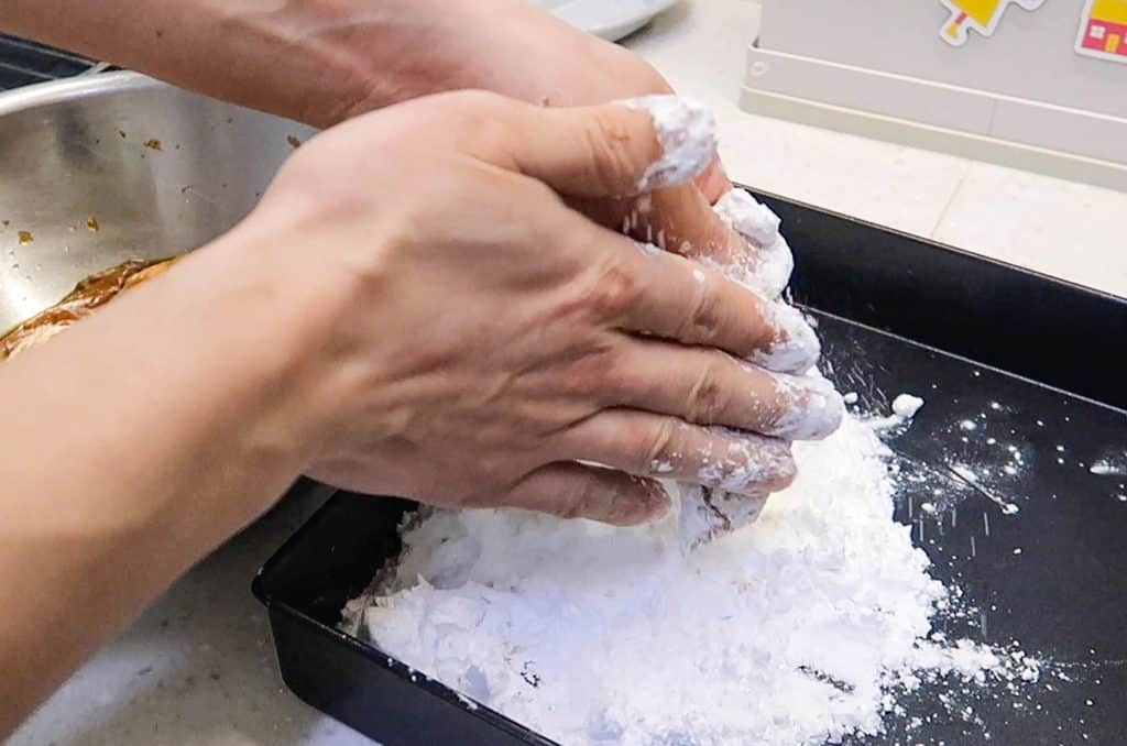 After coating, gently shake (or tap) the piece. We want to shake-off excess starch powder (important!)