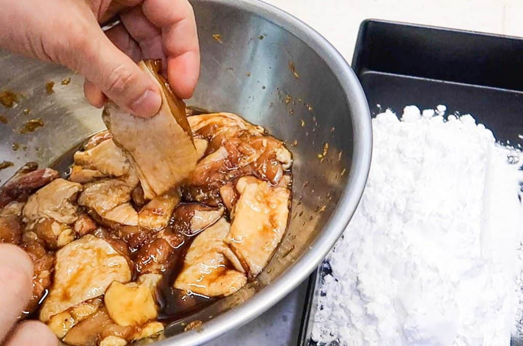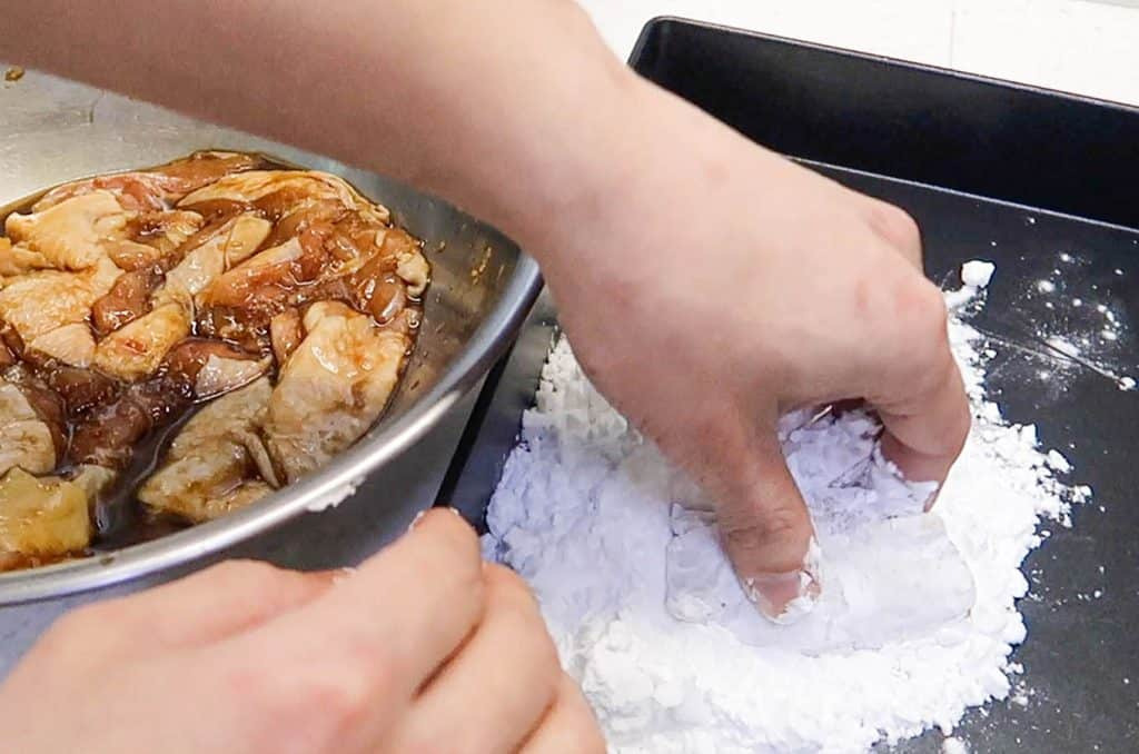 First, shake off excess marinade from the chicken… before rolling into the starch powder