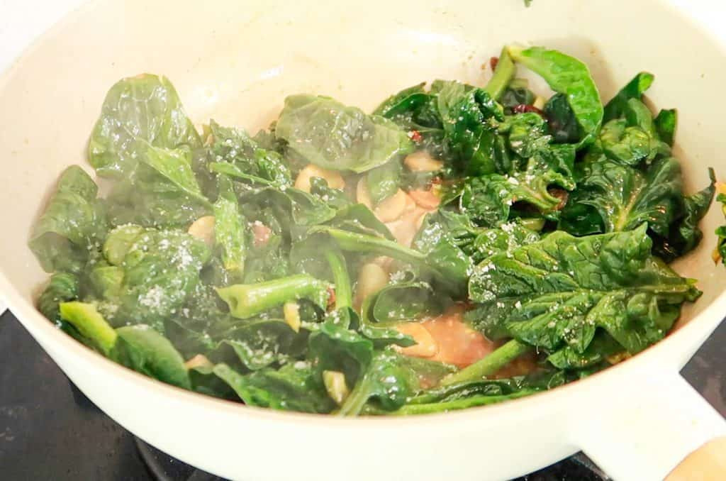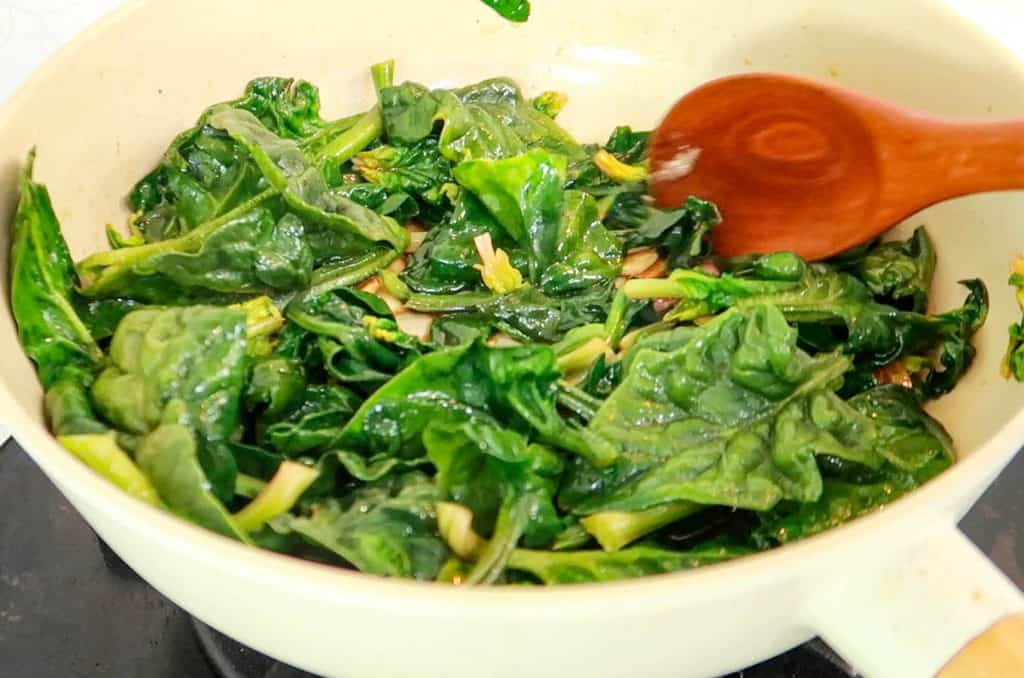 We don’t want to stir-fry the spinach for too long – as they will continue to wilt down in the heat.