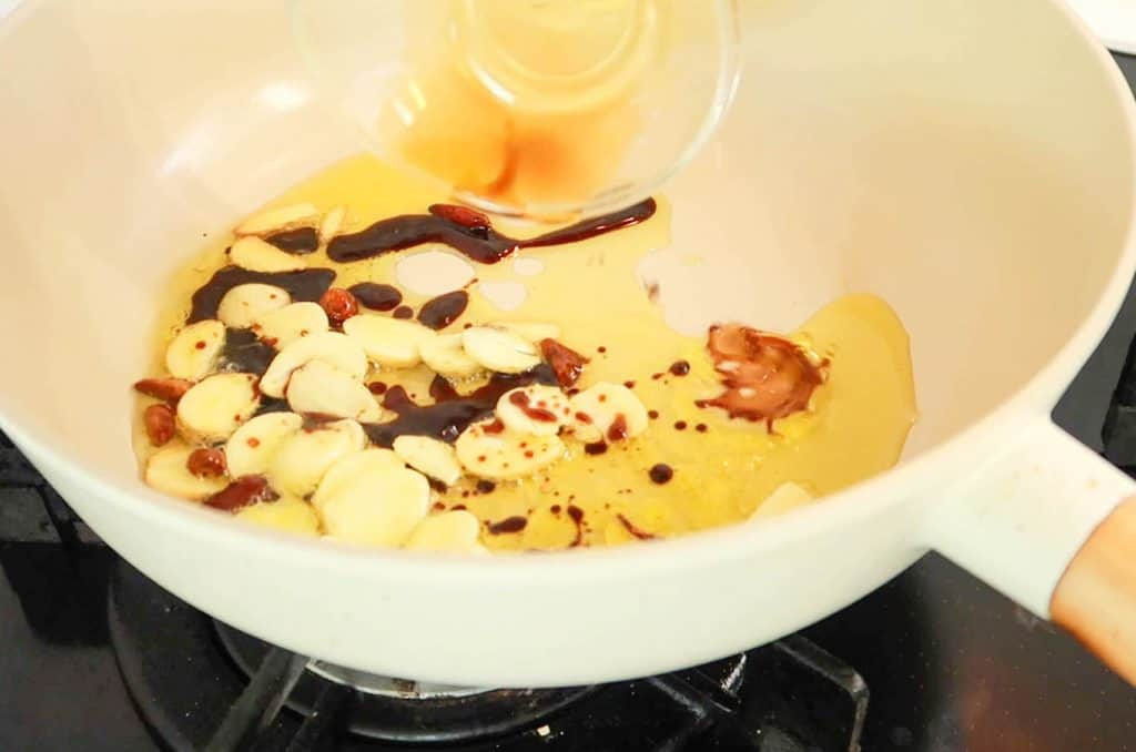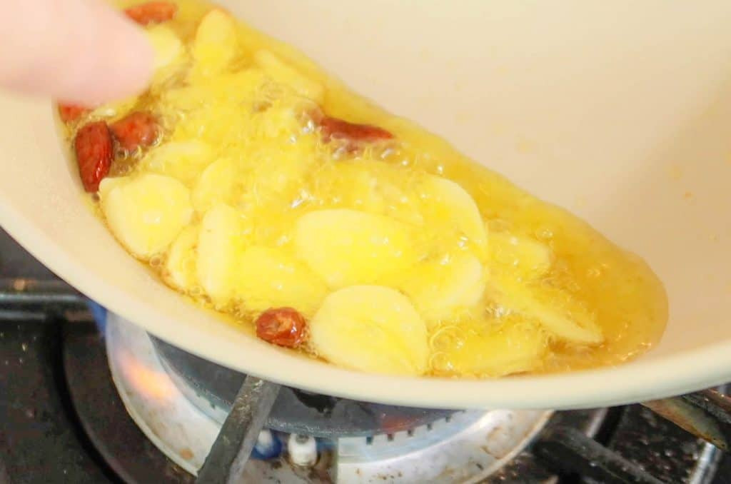 Add in garlic slices and peperoncino. Then place the wok on medium-heat and wait until the ingredients sizzle in the oil.