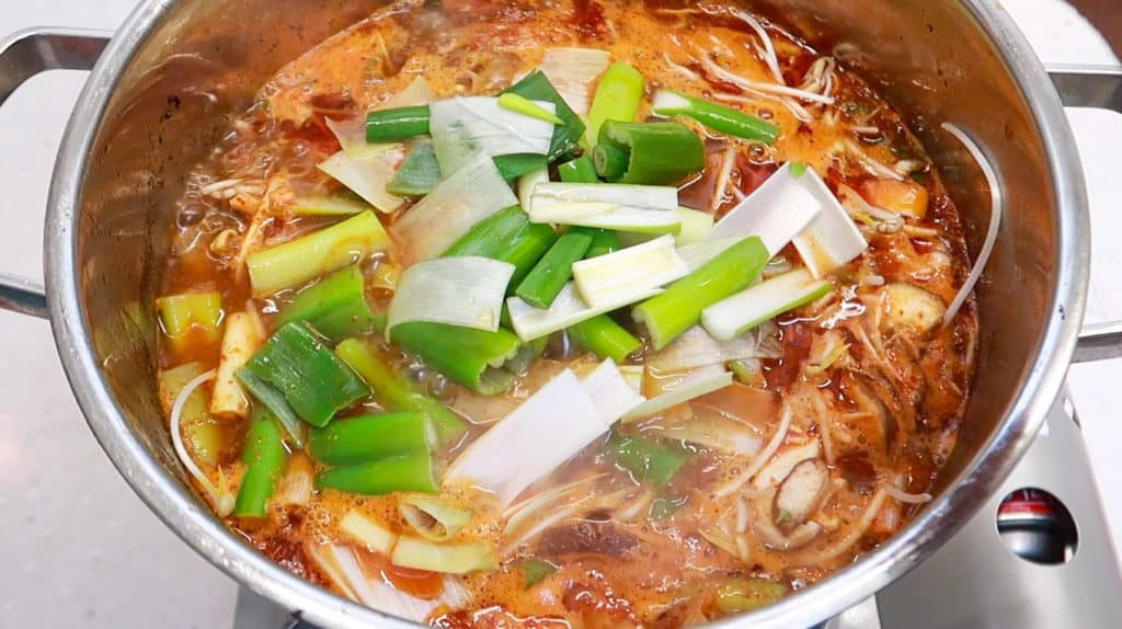 When the stew comes to a boil, it's time to add in all of the fresh ingredients: Sliced shiitake mushrooms, Chopped chili peppers, Mungbean sprouts, the Remaining Spring Onion Slices.