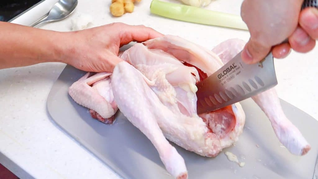 Give the entire chicken a final rinse under running water. Then set onto a cutting board. Use a knife to cut through the breast piece - so the chicken can open-up and lie flatter (so it can be easily submerged into the pot).