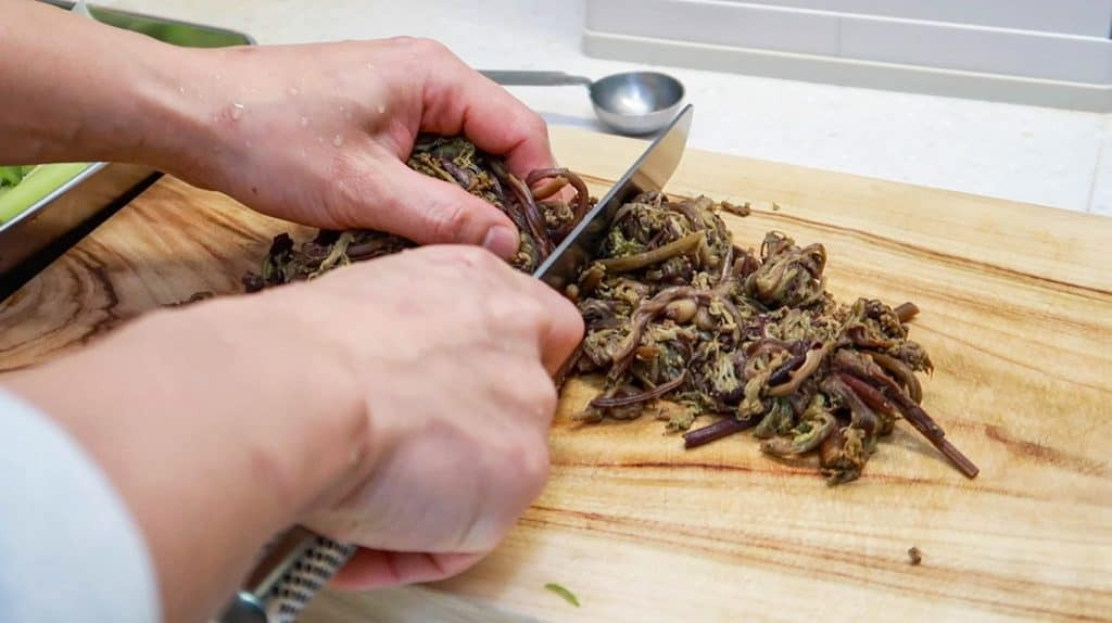 Open the Gosari (300g) from its package. Then give them a thorough rinse under running water. Afterwards, use your hands to squeeze-out the water from them. Untangle the squeezed bundles and dice them into bite-sized pieces.