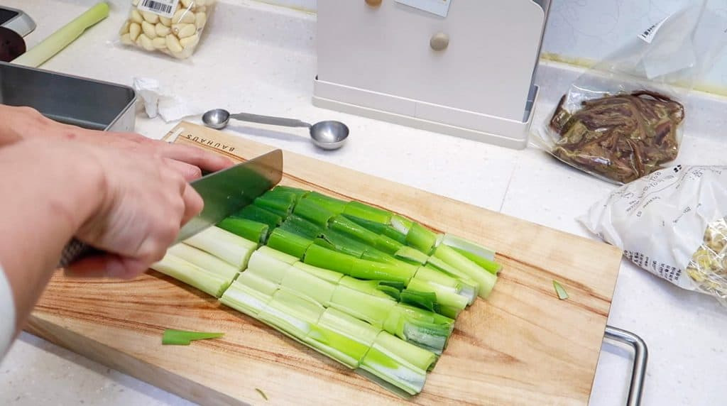 Make sure to use plenty of spring onions! We’re using 5 forearm-length stalks of spring onion.