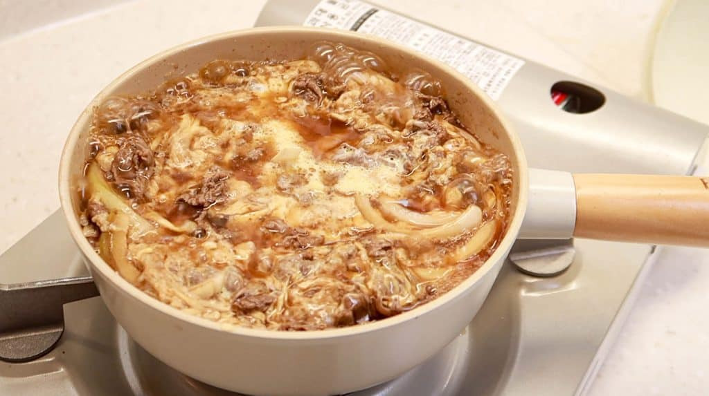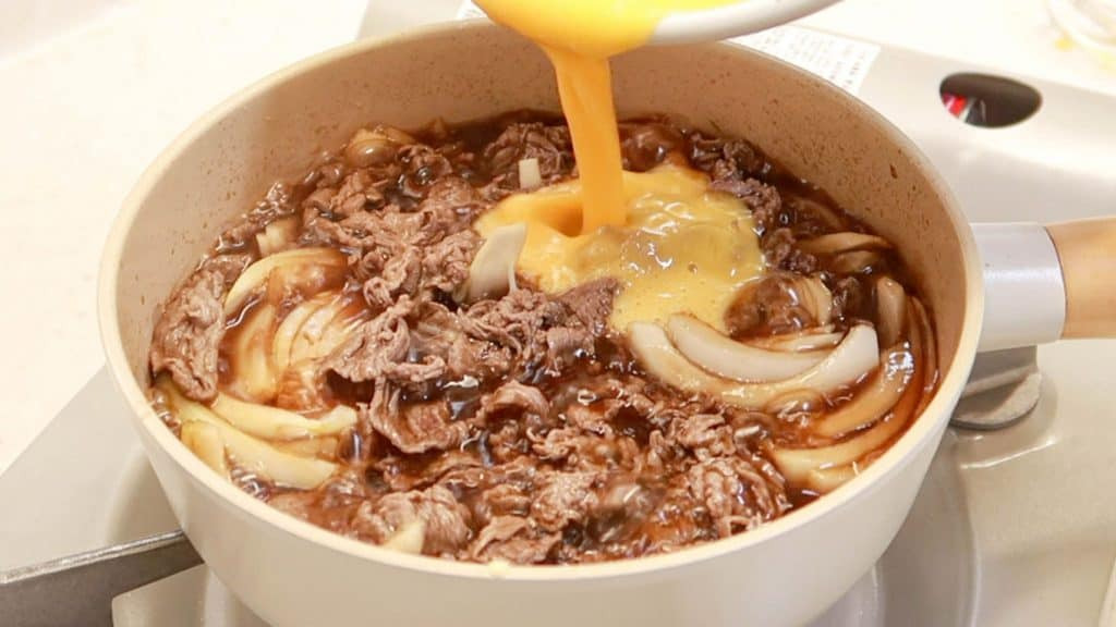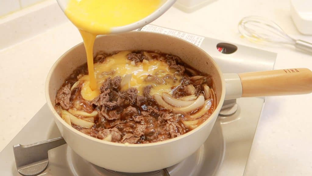 At the end – my favorite part – we’ll pour 2 beaten eggs over the top. The beaten eggs will set with the sliced beef.