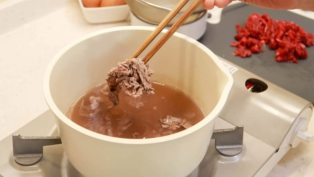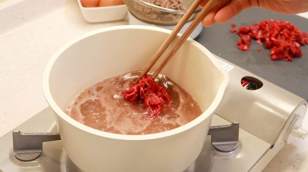 Instead, we’ll build our broth by blanching thin cuts of beef – in a small amount of water.