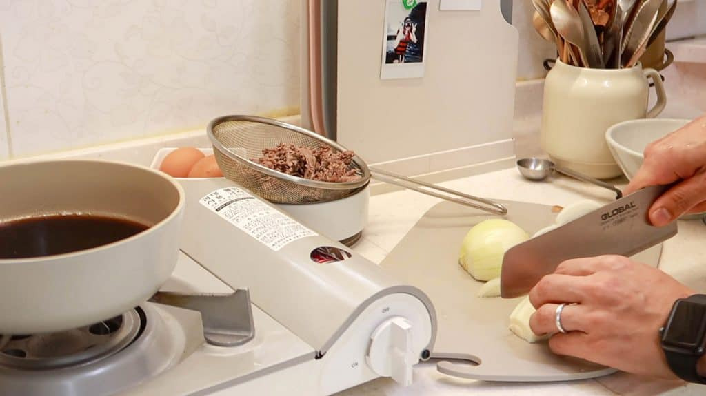 Dice one whole onion into thin strips. Add the onion slices into the pot.