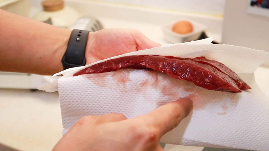 Take out a few paper towels and pat-off any excess liquid from the thinly sliced beef (200g).