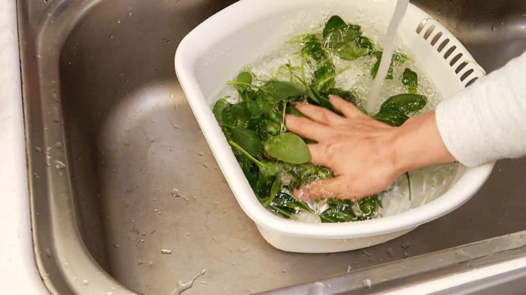 Next, thoroughly wash spinach (80g) - rinse it twice to get them clean. Then drain the water and place them onto a strainer to drip off excess water.