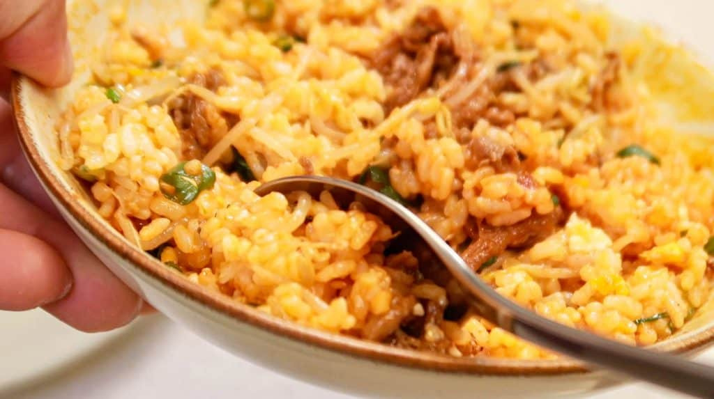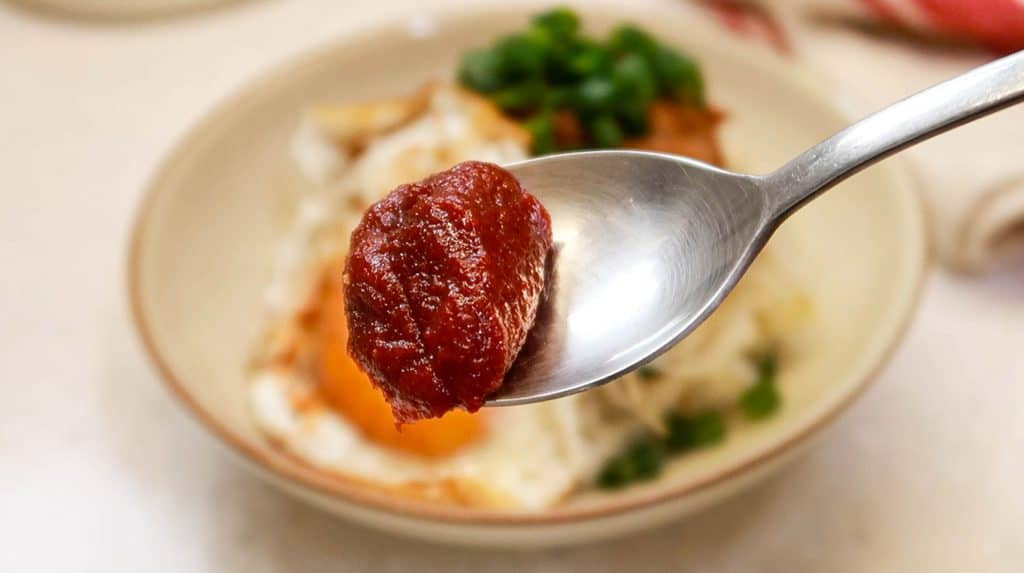 Since this recipe is a “quick and simple” bibimbap – we’re using a scoop of gochujang (straight from the tub).