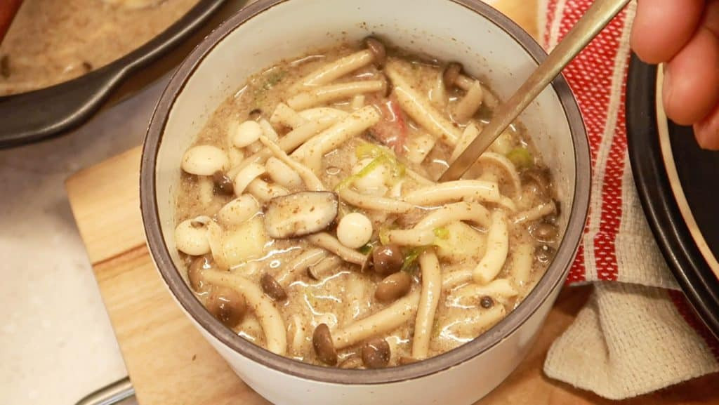 I highly recommend adding ½ a whole chili pepper – this chili slices give a refreshing kick to the overall earthy, savory taste of the soup.