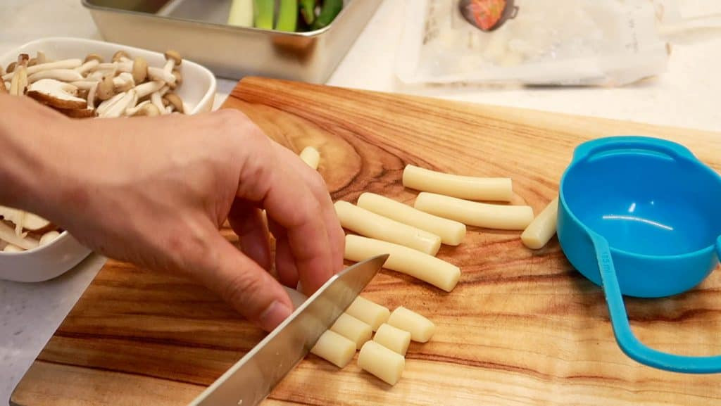 If you're using Tteok (rice cakes), measure ~½ Cup worth. Cut each into small bite-sized pieces. Then soak the pieces in cold water for at least 10-15 mins.