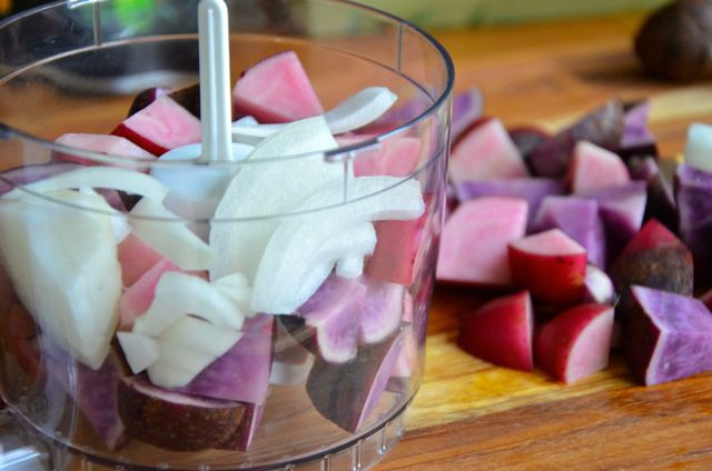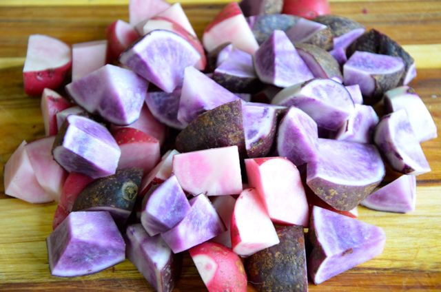 - 1 lb potatoes (starchy) – I used a mix of red and purple potatoes here