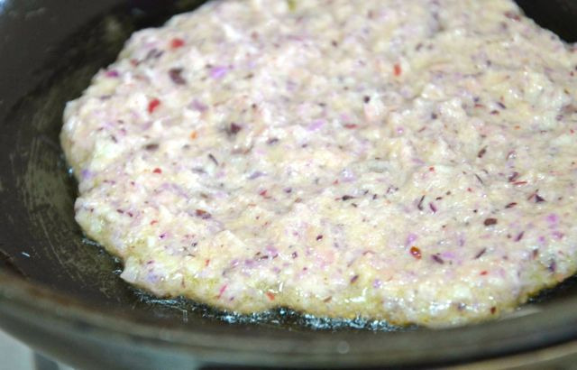 Ladle the potato mix onto the hot pan. Spread out evenly to about 1/3 in thickness. One full ladle should make one 6 inch pancake.